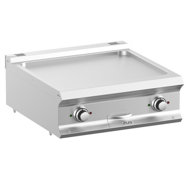 Elektromos lapsütő sima lappal rozsdamentes kivitelben. Előlapon elhelyezett IPX5 vízállóságú forgatógombos kezelőfelülettel, visszajelző lámpákkal, biztonsági termosztáttal és termosztatikus hőmérséklet-szabályozással. 2db max.5kW teljesítményű zónával,15mm vastag, 630×540mm méretű öntöttvas sütőfelülettel. Hőfoktartomány: 75-290°C között. Tartozék: 1db kivehető zsírgyűjtő fiók. Elektromos csatlakozás: 400V. Súly: 75 kg. A süllyesztett sütőfelületnek köszönhetően az opcionálisan vásárolható teflonozott dugóval bőzsírban sütés is lehetővé válik a készülékben! Új robosztus dizájn. Az öntöttvas rostlapon süthetünk húst, kolbászt, halat, pirítóst akár egy időben is. A gázüzemű rostlap segítségével az ételeket nagyon rövid idő alatt tudjuk elkészíteni minimális mennyiségű zsír hozzáadásával. Ideális büfék, éttermek, szállodák, üzemi konyhák, közintézmények és vendéglátóegységek kiszolgálására!
