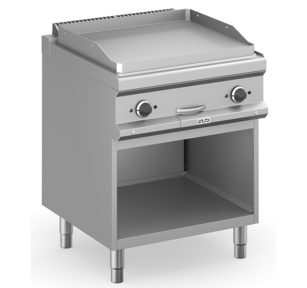 Elektromos lapsütő sima lappal nyitott alsó szekrényen rozsdamentes kivitelben. Rozsdamentes három oldalt burkolt, elöl nyitott készülékállványon alsó polccal. Előlapon elhelyezett IPX5 vízállóságú forgatógombos kezelőfelülettel, visszajelző lámpákkal, biztonsági termosztáttal és termosztatikus hőmérséklet-szabályozással. 2 db max.4 kW teljesítményű zónával,15 mm vastag, 650×570mm méretű öntöttvas sütőfelülettel. Tartozék: 1db kivehető zsírgyűjtő fiók. Elektromos csatlakozás: 400V.