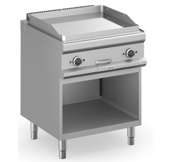 Elektromos lapsütő sima lappal nyitott alsó szekrényen rozsdamentes kivitelben. Rozsdamentes három oldalt burkolt, elöl nyitott készülékállványon alsó polccal. Előlapon elhelyezett IPX5 vízállóságú forgatógombos kezelőfelülettel, visszajelző lámpákkal, biztonsági termosztáttal és termosztatikus hőmérséklet-szabályozással. 2 db max.4 kW teljesítményű zónával,15 mm vastag, 650×570mm méretű krómozott sütőfelülettel. Tartozék: 1db kivehető zsírgyűjtő fiók. Elektromos csatlakozás: 400V.