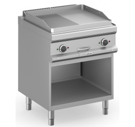 Elektromos lapsütő félig sima, félig bordázott lappal nyitott alsó szekrényen rozsdamentes kivitelben. Rozsdamentes három oldalt burkolt, elöl nyitott készülékállványon alsó polccal. Előlapon elhelyezett IPX5 vízállóságú forgatógombos kezelőfelülettel, visszajelző lámpákkal, biztonsági termosztáttal és termosztatikus hőmérséklet-szabályozással. 2 db max.4 kW teljesítményű zónával,15 mm vastag, 650×570mm méretű öntöttvas sütőfelülettel. Tartozék: 1db kivehető zsírgyűjtő fiók. Elektromos csatlakozás: 400V.