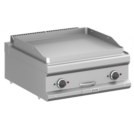 Elektromos lapsütő sima lappal rozsdamentes kivitelben. Előlapon elhelyezett IPX5 vízállóságú forgatógombos kezelőfelülettel, visszajelző lámpákkal, biztonsági termosztáttal és termosztatikus hőmérséklet-szabályozással. 2 db max.4 kW teljesítményű zónával,15 mm vastag, 650×570mm méretű öntöttvas sütőfelülettel. Tartozék: 1db kivehető zsírgyűjtő fiók. Elektromos csatlakozás: 400V.