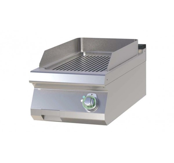 Rozsdamentes burkolat, lekerekített élek, 12 mm vastag bordázott, öntöttvas sütőfelület, zsírgyűjtőfiók.