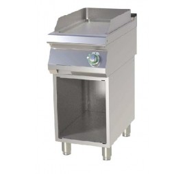 Rozsdamentes burkolat, szintezhető lábak, lekerekített élek, 12 mm vastag sima, krómozott sütőfelület, zsírgyűjtőfiók.