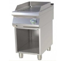 Rozsdamentes burkolat, szintezhető lábak, lekerekített élek, 12 mm vastag bordázott, krómozott sütőfelület, zsírgyűjtőfiók.