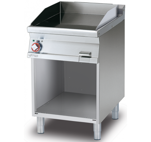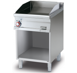 Rozsdamentes burkolat, szintezhető lábak, lekerekített élek, főzősorba illeszthető, 3 oldalon zárt elől nyitott tároló. Igény szerint az ajtó rendelhető, félig sima, félig bordázott, öntöttvas sütőfelület, kivehető 3 oldali fröccsenésgátló perem, zsírgyűjtőfiók, rozsdamentes tisztító lapát, termosztatikus hőfokszabályozás 50-300°C.