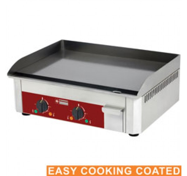 Asztali elektromos üzemű sütőlap (2x3 kW), sima bevonatos acél lappal és oldalmagasítással, zsírgyűjtő fiókkal, mechanikus hőfokszabályozással: 0-300°C között, rozsdamentes acél kivitelben.