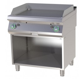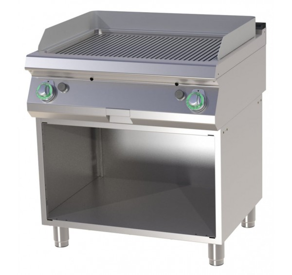 Rozsdamentes burkolat, szintezhető lábak, lekerekített élek, 12 mm vastag bordázott, krómozott sütőfelület, zsírgyűjtőfiók.