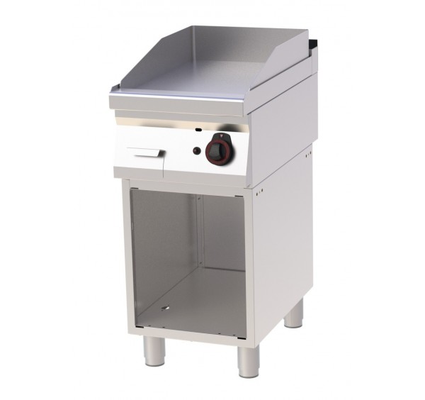 Rozsdamentes burkolat, lekerekített élek, 12 mm vastag sima, öntöttvas sütőfelület, zsírgyűjtőfiók, alul nyitott tárolóval, állítható lábakkal.