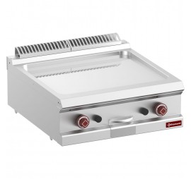blokkba építhető asztali gázüzemű sütőlap (2x7 kW), 630x540 mm méretű 2 független zónás sima krómozott lappal, körben fröccsenésgátló felhajtással, elöl zsírgyűjtő fiókkal, piezo gyújtással, égéstermék elvezetővel, rozsdamentes acél kivitelben, szintező talpakkal.