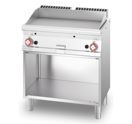 Rozsdamentes burkolat, szintezhető lábak, lekerekített élek, főzősorba illeszthető, 3 oldalon zárt elől nyitott tároló. Sima, 2 zónás, krómozott sütőfelület, kivehető 3 oldali fröccsenésgátló perem.