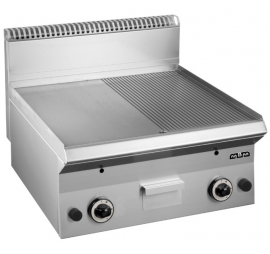 Gázüzemű szeletsütő félig sima, félig bordázott sütőfelülettel, termosztátos hőfokszabályzással, 2 fűtőzónával, biztonsági mágnes szeleppel, kivehető olaj gyűjtő fiókkal. Könnyen tisztítható, higiénikus.