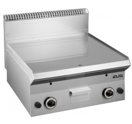 Gázüzemű szeletsütő sima sütőfelülettel, termosztátos hőfokszabályzással, 2 fűtőzónával, biztonsági mágnes szeleppel, kivehető olaj gyűjtő fiókkal. Könnyen tisztítható, higiénikus.