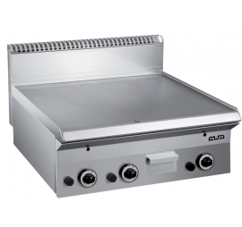 Gázüzemű szeletsütő sima sütőfelülettel, termosztátos hőfokszabályzással, 3 fűtőzónával, biztonsági mágnes szeleppel, kivehető olaj gyűjtő fiókkal. Könnyen tisztítható, higiénikus.