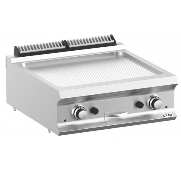 Gázüzemű lapsütő bordázott lappal rozsdamentes kivitelben. Előlapon elhelyezett IPX5 vízállóságú forgatógombos kezelőfelülettel, visszajelző lámpákkal, piezoelektromos gyújtással, őrlánggal, biztonsági termosztáttal és termosztatikus hőmérséklet-szabályozással. 2db max.7kW teljesítményű égőfejjel,10mm vastag, 630×540mm méretű bordázott krómozott sütőfelülettel. Hőfoktartomány: 145-290°C között. Tartozék: 1db kivehető zsírgyűjtő fiók. Gázcsatlakozás: 1/2". Súly: 75 kg. A süllyesztett sütőfelületnek köszönhetően az opcionálisan vásárolható teflonozott dugóval bőzsírban sütés is lehetővé válik a készülékben! Új robosztus dizájn.