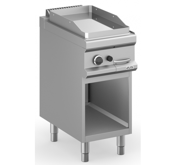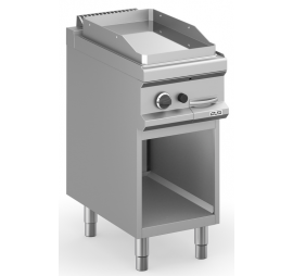 Gázüzemű lapsütő sima lappal nyitott alsó szekrényen rozsdamentes kivitelben. Rozsdamentes három oldalt burkolt, elöl nyitott készülékállványon alsó polccal. Előlapon elhelyezett IPX5 vízállóságú forgatógombos kezelőfelülettel, visszajelző lámpákkal, piezoelektromos gyújtással, őrlánggal, biztonsági termosztáttal és termosztatikus hőmérséklet-szabályozással. 1db max.5,5 kW teljesítményű égőfejjel,15mm vastag, 350×570mm méretű krómozott sütőfelülettel. Tartozék: 1db kivehető zsírgyűjtő fiók. Gázcsatlakozás: 1/2". Súly: 63 kg.