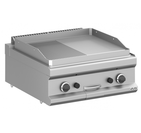 Gázüzemű lapsütő félig sima, félig bordázott lappal rozsdamentes kivitelben. Előlapon elhelyezett IPX5 vízállóságú forgatógombos kezelőfelülettel, visszajelző lámpákkal, piezoelektromos gyújtással, őrlánggal, biztonsági termosztáttal és termosztatikus hőmérséklet-szabályozással. 2db max.5,5 kW teljesítményű égőfejjel,15mm vastag, 650×570mm méretű öntöttvas sütőfelülettel. Tartozék: 1db kivehető zsírgyűjtő fiók. Gázcsatlakozás: 1/2".