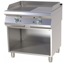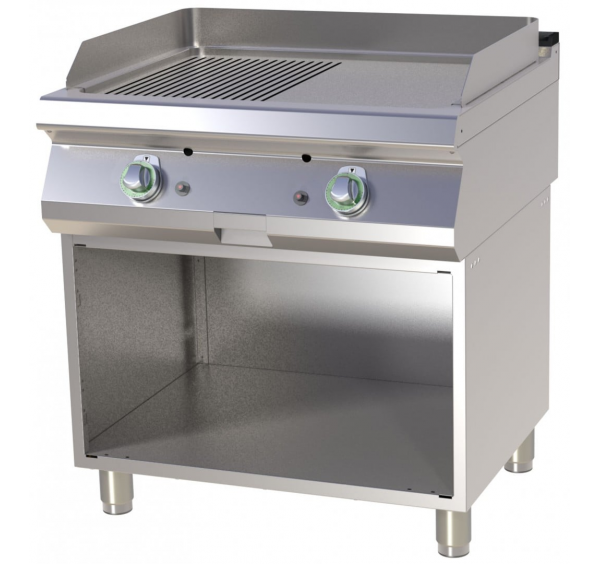 Rozsdamentes burkolat, szintezhető lábak, lekerekített élek, 12 mm vastag félig sima, félig bordázott öntöttvas sütőfelület, zsírgyűjtőfiók.