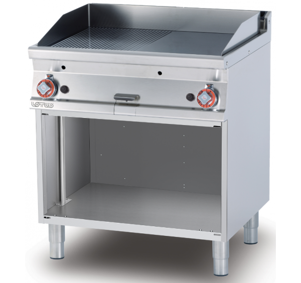 Rozsdamentes burkolat, szintezhető lábak, lekerekített élek, főzősorba illeszthető, 3 oldalon zárt elől nyitott tároló. Igény szerint az ajtó rendelhető, 2 zónás, félig sima, félig bordázott, öntöttvas sütőfelület.