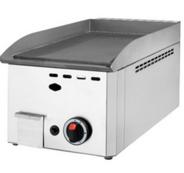 Asztali gázüzemű sütőlap sima öntöttvas sütőfelülettel, zsírgyűjtő fiókkal, mechanikus vezérléssel, hőfokszabályozás: 50-300°C között, rozsdamentes acél burkolattal.