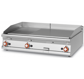 Rozsdamentes burkolat, szintezhető lábak, lekerekített élek, 2/3 sima, 1/3 bordázott, 3 zónás krómozott sütőfelület.