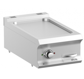 Elektromos lapsütő sima lappal rozsdamentes kivitelben. Előlapon elhelyezett IPX5 vízállóságú forgatógombos kezelőfelülettel, visszajelző lámpákkal, biztonsági termosztáttal és termosztatikus hőmérséklet-szabályozással. 1db max.5kW teljesítményű zónával,15mm vastag, 330×540mm méretű öntöttvas sütőfelülettel. Hőfoktartomány: 75-290°C között. Tartozék: 1db kivehető zsírgyűjtő fiók. Elektromos csatlakozás: 400V. Súly: 43 kg. Új robosztus dizájn.