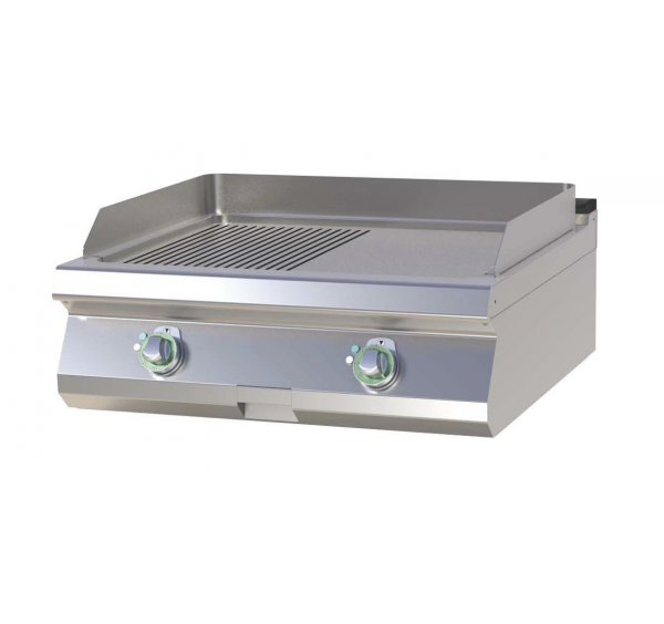Rozsdamentes burkolat, lekerekített élek, 12 mm vastag, félig sima, félig bordázott öntöttvas sütőfelület, zsírgyűjtőfiók.