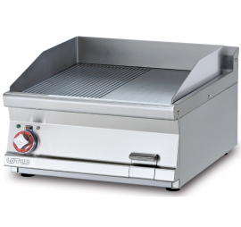 Rozsdamentes burkolat, szintezhető lábak, lekerekített élek, félig sima, félig bordázott,öntöttvas sütőfelület.