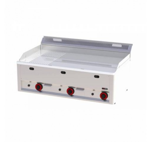 3 zónás RedFox asztali gázüzemű rostlap 2/3 sima, 1/3 bordázott, krómozott sütőfelülettel