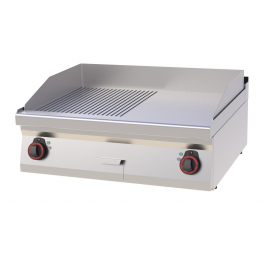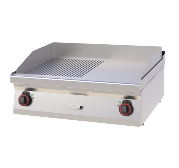 Rozsdamentes burkolat, lekerekített élek, 12 mm vastag sima, öntöttvas sütőfelület, zsírgyűjtőfiók.