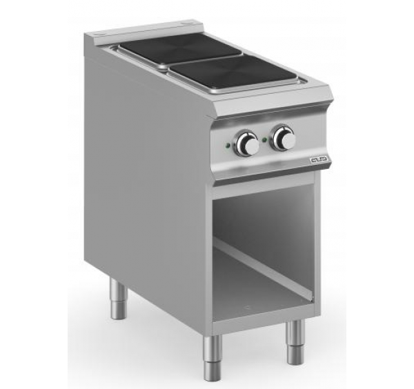 Elektromos tűzhely 2 db szögletes főzőlappal, nyitott alsó szekrényen, rozsdamentes kivitelben, 2 db max. 3 kW teljesítményű főzőlappal. A főzőlapok mérete 300x300 mm. Előlapon elhelyezett IPX5 vízállóságú 7 fokozatú forgatógombos kezelőfelülettel, visszajelző lámpákkal, biztonsági termosztáttal és termosztatikus hőmérséklet-szabályozással. Hőfoktartomány: 50-400°C között. Új robosztus dizájn, csavar nélküli kémény és könnyen levehető alsó lemez, melyek egyszerűen eltávolíthatók, megkönnyítik a készülék bekötését, majd a későbbiekben a berendezés illetve az alatta lévő terület tisztítását. Ideális büfék, éttermek, szállodák, üzemi konyhák, közintézmények, cukrászdák és vendéglátóegységek kiszolgálására!