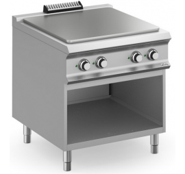 Telelapos elektromos tűzhely rozsdamentes acél kivitelben. Előlapon elhelyezett IPX5 vízállóságú forgatógombos kezelőfelülettel, biztonsági termosztáttal és termosztatikus hőmérséklet-szabályozással. 4 db max. 3,5 kW teljesítményű zónával, 15 mm vastag főzőlappal. Hőfoktartomány: 80-450°C között. Új robosztus dizájn, csavar nélküli kémény és könnyen levehető alsó lemez, melyek egyszerűen eltávolíthatók, megkönnyítik a készülék bekötését, majd a későbbiekben a berendezés illetve az alatta lévő terület tisztítását.