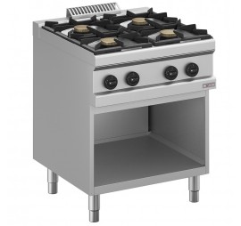 4 égős gáztűzhely (4×5,5 kW), süllyesztett fedlappal, nagy hatásfokú öntöttvas égőkkel, égéstermék elvezetővel, mechanikus hőfokszabályozással, alul GN 2/1-es belméreű alsó polcos nyitott készüléktartó pulttal, rozsdamentes acél kivitelben, állítható magasságú lábakkal, ajtószett külön rendelhető hozzá