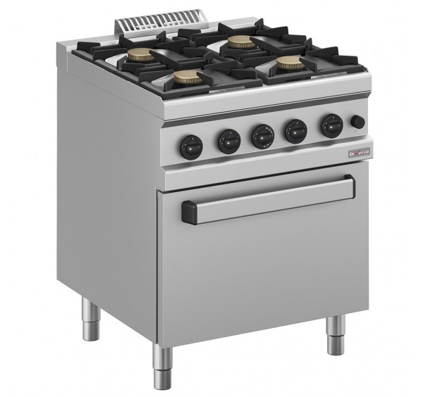 4 égős gáztűzhely (4×5,5 kW), süllyesztett fedlappal, nagy hatásfokú öntöttvas égőkkel, égéstermék elvezetővel, alul GN 2/1-es 560x630x295 mm belméretű gázüzemű sütővel (5,2 kW), 160-310°C közti mechanikus hőfokszabályzással, rozsdamentes acél kivitelben, állítható magasságú lábakkal