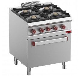 Blokkba építhető 4 égős gáztűzhely (4x7 kW), 330x300 mm méretű öntöttvas edénytartó rácsokkal, piezo gyújtással, 1,5-7 kW közti égőszabályzással, égéstermék elvezetővel, 560x660x310 mm méretű GN 2/1-es elektromos üzemű grillezős sütővel (5,3 kW), 125-300°C közti sütési hőfokkal, hőszigetelt duplafalú sütővel és sütőajtóval, 1 db sütőráccsal szállítva, kívül-belül rozsdamentes acél burkolattal, állítható rozsdamentes acél lábakkal.