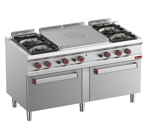 blokkba építhető 1 zárt égős (francia lapos - 10 kW) és kétoldalt 2+2 nyílt égős gáztűzhely (4x7 kW), 670x585 mm méretű 10 mm vastagságú öntöttvas francia lappal, 330x300 mm-es öntöttvas edénytartó rácsokkal, piezo gyújtással, 1,5-7 kW közti égőszabályzással, égéstermék elvezetővel, alul 2 db 560x660x310 mm méretű GN 2/1-es gázüzemű sütővel (2x6 kW), 150-290°C közti hőfokszabályzással, hőszigetelt duplafalú sütővel és sütőajtóval, 3 tálca kapacitással - de 1 db sütőráccsal szállítva, rozsdamentes acél kivitelben, állítható rozsdamentes acél lábakkal