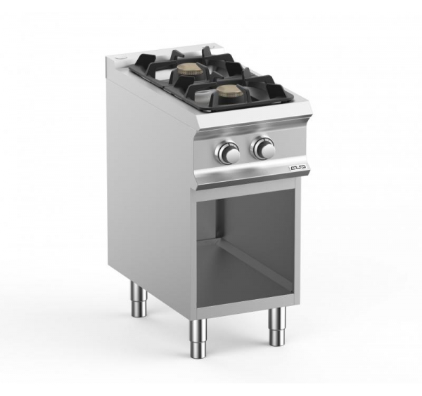 2 égős gáztűzhely rozsdamentes acél kivitelben. Rozsdamentes három oldalt burkolt, elöl nyitott készülékállványon alsó polccal. Előlapon elhelyezett IPX5 vízállóságú forgatógombos kezelőfelülettel, piezoelektromos gyújtással, őrlánggal, biztonsági termosztáttal és termosztatikus hőmérséklet-szabályozással. 2db max.7kW teljesítményű sárgaréz égőfejjel.