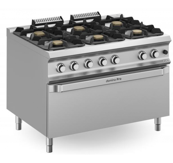 6 égős gáztűzhely extra nagy gázüzemű sütővel, 3 db max. 11 kW és 3 db max. 7 kW teljesítményű sárgaréz égőfejjel, őrlánggal és termosztatikus hőmérséklet-szabályozással. Új robosztus dizájn, csavar nélküli alsó lemez és kémény, melyek egyszerűen eltávolíthatók, megkönnyítik a készülék bekötését, majd a későbbiekben a berendezés illetve az alatta lévő terület tisztítását.