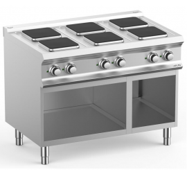 Álló elektromos üzemű tűzhely 6 szögletes főzőlappal (6x2,6 kW),előlapon elhelyezett 7 fokozatú forgatógombos kezelőfelülettel, kontroll lámpákkal, rozsdamentes acél kivitelben. Könnyen tisztítható, higiénikus.