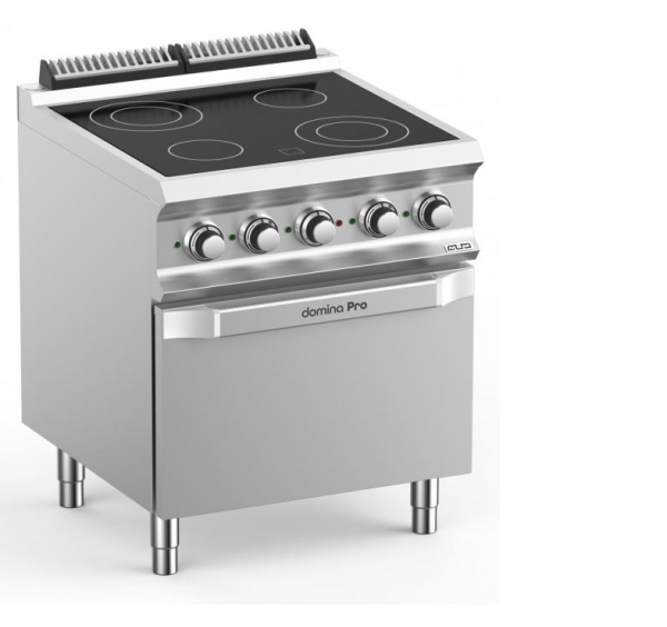 Álló elektromos üzemű tűzhely 4 zónás 6mm vastag üvegkerámia főzőlappal (2x1,8 kW + 2x2,5 kW), Ø180 + Ø250 mm főzőzónákkal, GN2/1 méretű max.5,3kW teljesítményű elektromos sütővel, 1 db sütőráccsal, előlapon elhelyezett 3 fokozatú forgatógombos kezelőfelülettel, kontroll lámpákkal, rozsdamentes acél kivitelben. Könnyen tisztítható, higiénikus.