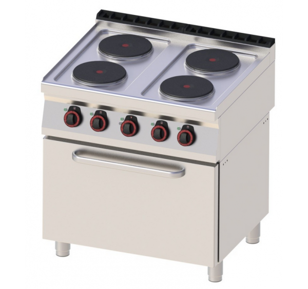 Rozsdamentes acél burkolattal, 4 db, egyenként 2,6 kW teljesítménnyel üzemelő, kör alakú, 220 mm átmérőjű, öntöttvas főzőlappal rendelkezik. A főzőlapok belső hővédelemmel vannak ellátva a túlmelegedés ellen. Forgatógombos teljesítményszabályozás 6 pozícióban. A GN2/1-es elektromos statikus sütő hőmérséklete 50-300 °C között szabályozható. Tartozék: 1 db sütőrács. Alul nyitott semleges szekrényre van helyezve, melyhez opcionálisan rendelhető ajtó.