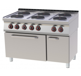 Rozsdamentes acél burkolattal, 6 db, egyenként 2,6 kW teljesítménnyel üzemelő, kör alakú, 220 mm átmérőjű, öntöttvas főzőlappal rendelkezik. A főzőlapok belső hővédelemmel vannak ellátva a túlmelegedés ellen. Forgatógombos teljesítményszabályozás 6 pozícióban. A GN2/1-es elektromos statikus sütő hőmérséklete 50-300 °C között szabályozható. Tartozék: 1 db sütőrács. Alul nyitott semleges szekrényre van helyezve, melyhez opcionálisan rendelhető ajtó.