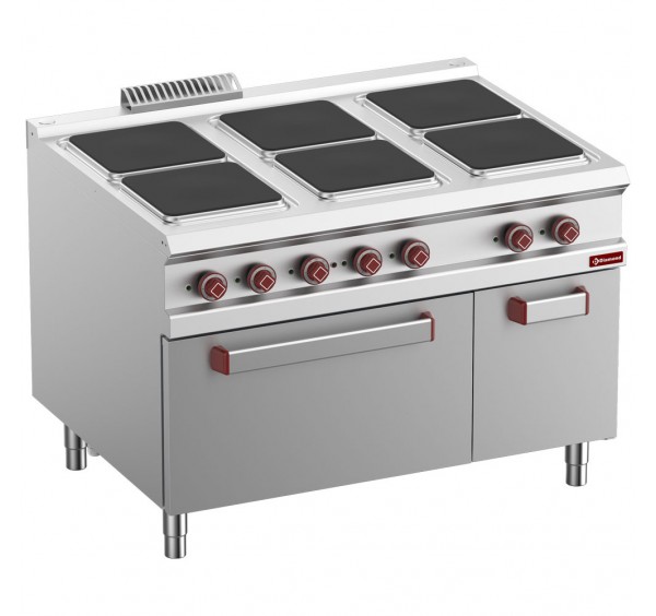 Blokkba építhető elektromos üzemű tűzhely 6 db szögletes 300x300 mm méretű öntöttvas főzőlappal (4x3 kW + 2x4 kW), 7 fokozatú hőmérsékletszabályzással, GN 2/1-es (535x650x300 mm) belméretű elektromos üzemű statikus sütővel (6 kW), 125-300°C közti hőfokszabályozással, ajtóval zárt 360x740x360 mm belméretű semleges tárolóval, szintezhető lábakkal, rozsdamentes acél kivitelben. Sütőtepsik és rácsok nélkül szállítva!