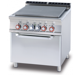 Elektromos üzemű tűzhely, 4 zónás egymástól függetlenül szabályozható francia lapos főzőfelülettel, 4 fokozatú hőfokszabályzóval, túlfűtés elleni védelemmel, jó hővezető képességgel, GN 1/1-es belméretű elektromos légkeveréses sütővel (5,32 kW), 1 db sütőráccsal, 50-300°C közti sütési hőfokszabályozással, lekerekített élekkel, szintezhető lábakkal, rozsdamentes acél kivitelben. Elektromos vezeték és dugvilla nélkül.
