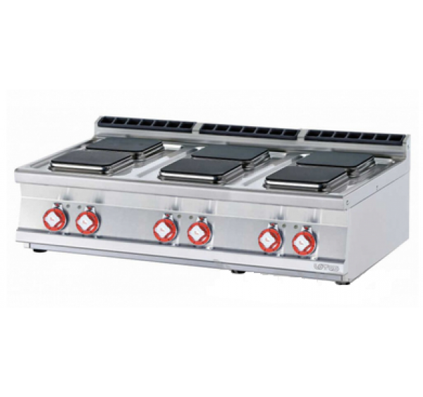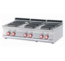 Elektromos üzemű tűzhely 6 db szögletes öntöttvas főzőlappal (6x4 kW), 7 fokozatú hőmérsékletszabályzással, túlfűtés elleni védelemmel, szintezhető lábakkal, rozsdamentes acél kivitelben. Elektromos vezeték és dugvilla nélkül.